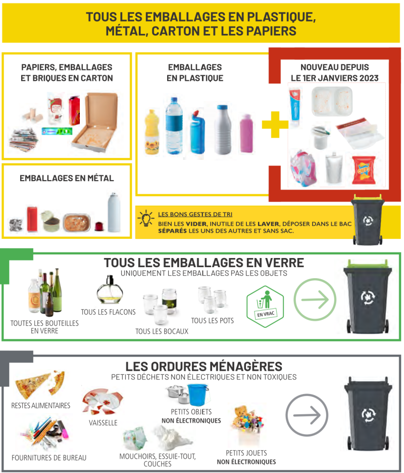 Pour les déchets déposés dans les poubelles jaunes, les sacs plastiques doivent être retirés pour permettre au service d'enlèvement des poubelles de Contrôler qu'il n'y a rien d'autre que des emballages en PAPIER, PLASTIC, CARTONS et METAL.